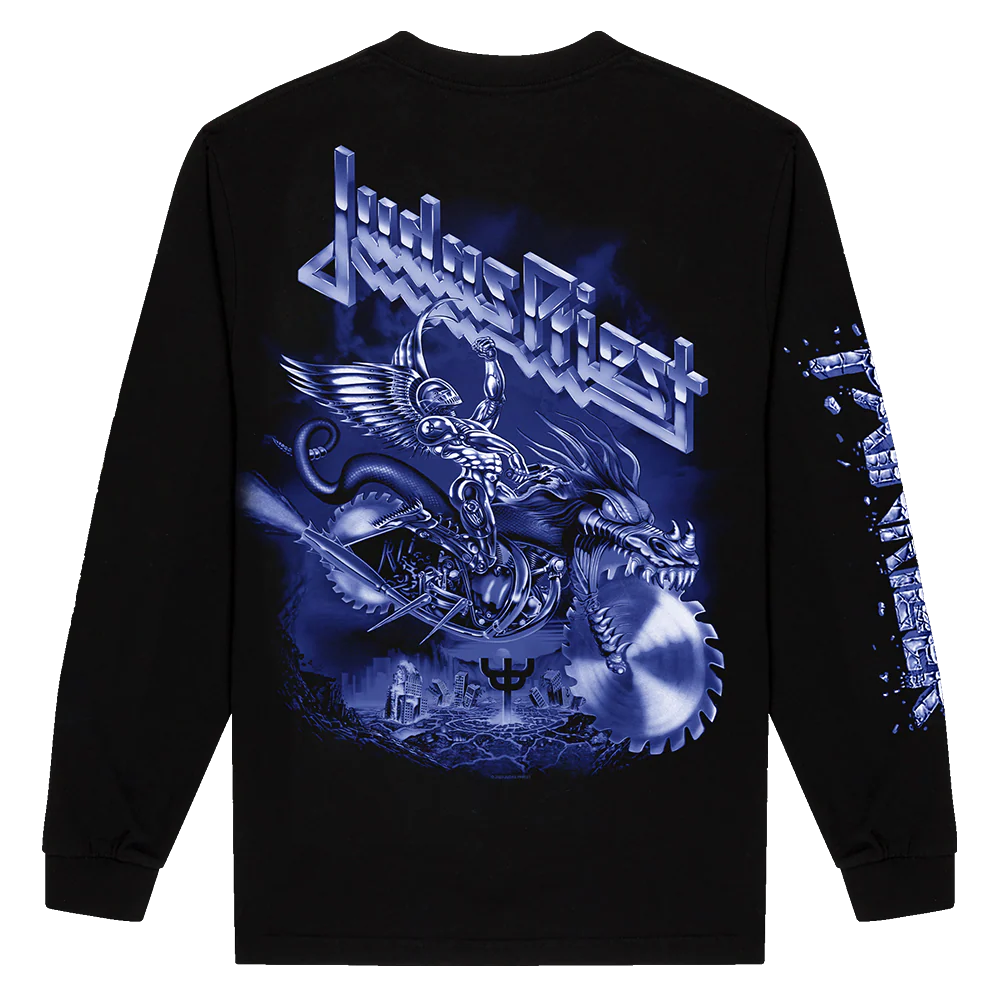 The Painkiller Album Long Sleeve Tee by Judas Priest features artwork from the original Painkiller album in a tonal blue design, printed on a 100% preshrunk cotton long sleeve tee.